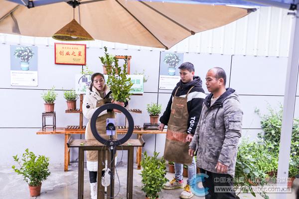 “大家现在看到的这款花苗,易栽种,花香持久,下单今天就能发货。”在凤新村的一处院子里,村民们正在热火朝天地直播带货,销售茉莉花苗。