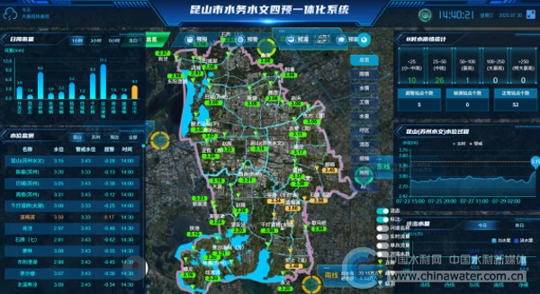 昆山市防汛指挥部大屏上,各骨干河道的排水量、流向、边界闸门启闭状态正实时跳动。苏州水文分局依托昆山市水务水文“四预”(预报、预警、预演、预案)一体化智慧平台,通过圩内外及上下游高密度监测站网,实时汇聚并集中展示河湖水位、流量、雨量等关键数据。平台通过专网将动态水雨情信息实时推送至市水务局及各区镇管理站,为边界闸门启闭、涝水抢排及外河水位调控等防汛决策提供核心数据支撑。