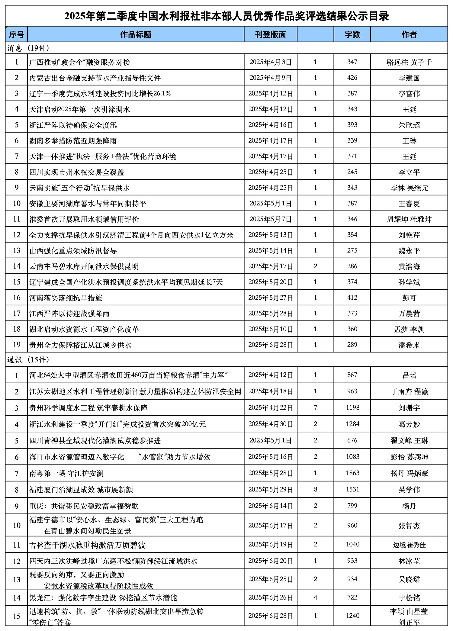 根据《中国水利报社非本部人员优秀作品奖评选奖励办法》要求,中国水利报社2025年第二季度非本部人员优秀作品奖评选工作已完成。经过评委投票,共评选出消息19件、通讯15件。现对评选结果进行公示,公示日期为2025年11月7日至2025年11月13日,公示期间,如有问题,请向记者读者部反映。