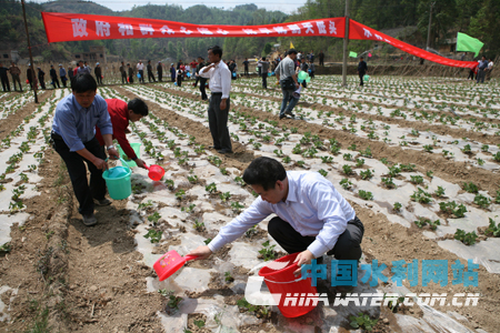 通水当天,黔南州州长李月成(前)与水利干部职工、当地群众一起抗旱保苗(金廷正摄)