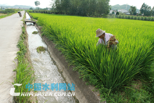 中国水利网站7月25日讯 (通讯员 张启龙 唐雪松)7月24日,湖北房县军店镇下茅坪村农民杨树沛在锄稻田杂草。该县以粮食增效、农民增收为目标,建设一批蓄水、保水的高效节水渠道,除险加固重点水库。近5年,完成新修节渠道512公里,除险加固水库59座,新修和改善农田灌溉面积8.5万亩,项目区年增产粮食1120万吨,农民实现人均收入达到5793元。