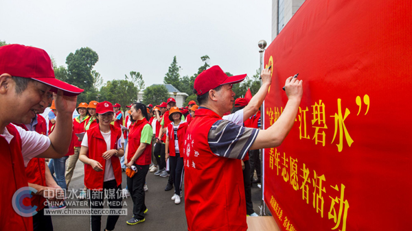 仪式现场,全体青年志愿者集体宣誓,将带头践行生态文明理念,带头倡导绿色生活方式,自觉与破坏水生态环境的行为作斗争,并在“守护好一江碧水”横幅上签名承诺。