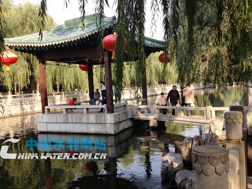 金秋十月,泉群河道两边垂柳依依,在微风的吹拂下不断摇摆着枝桠,阳光照耀在枝条上,照耀在水面上,闪着微微的金光。不时有一条游船驶过弯成一弯的桥梁,荡起阵阵涟漪,垂柳、行船倒映在水面上,居然有一丝安详。