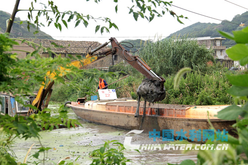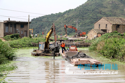 8月21日上午,一台水陆两栖挖泥船正在浙江省温岭市松门镇新跃河木耳村段清理河床淤泥。