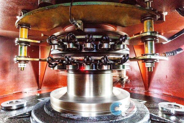 11月14日,淮安四站正在高速运转并接受工作人员检测温度(图中红色亮点为工作人员照射的探测光斑)的泵机轴承