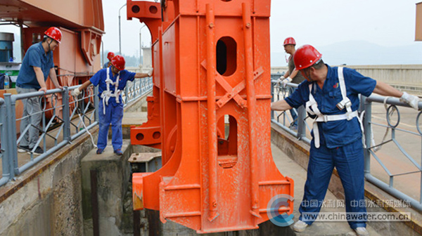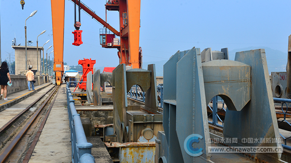 三门峡水利枢纽防汛职工使用450吨门机起吊闸门