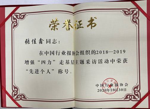 一年来,报社被中宣部、中国记协评为2020年“新春走基层”活动先进集体;被中国行业报协会授予增强“四力”走基层主题采访活动先进集体称号;多人多篇(幅)作品获得中国产经新闻奖一二等奖。