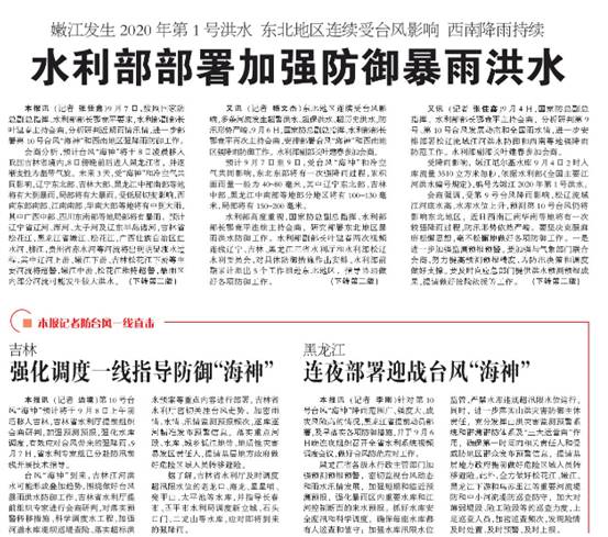 2020年9月8日,中国水利报头版报道水利部及各地部署防御台风“海神”相关信息