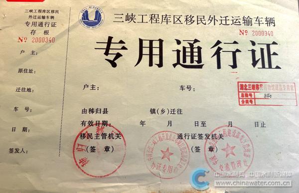 在湖北三峡移民博物馆内,珍藏着一张珍贵的通行证——“三峡工程库区移民外迁运输车辆专用通行证”,它是当年三峡移民外迁运输车辆在全国交通免费通行的专用证。