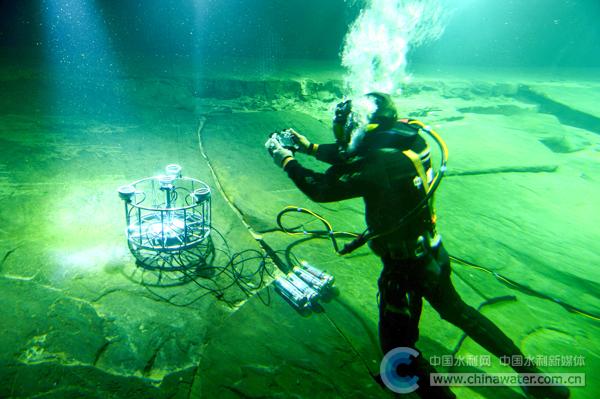 潜水员正在水下安装保护体灯光系统 白鹤梁水下博物馆供图