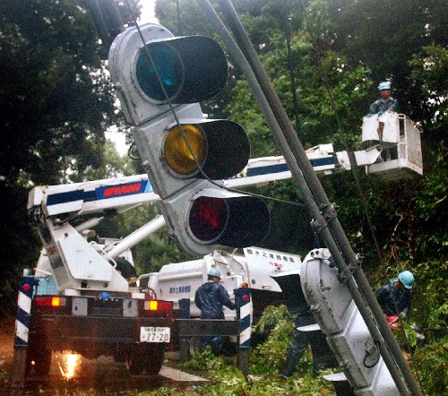 9月6日,在遭受台风“纳比”袭击的日本城山市,维修工人正在抢修被台风刮倒的交通指示灯。强大的“纳比”台风给日本西南部地区带来了强风和暴雨,造成了洪水和山体滑坡等灾害,迫使当地居民被迫离开家园,暂闭“风头”。“纳比”在韩语中意为“蝴蝶”。