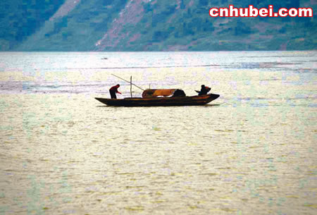 昔日湍急的西陵峡口,已变成小湖,小渔船在悠闲的捕鱼。