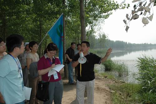 采访团向北京北运河管理处的工作人员了解地处温榆河岸边的白各庄湖生态区的建设情况