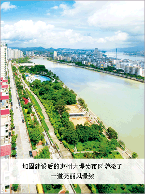 ——全省十大堤围之一的惠州大堤基本完成除险加固任务,其防洪标准从5年一遇~20年一遇提高到100年一遇,防洪排涝总装机由1600千瓦增加到20000千瓦。惠州大堤加固达标工程,是惠州实施城乡水利防灾减灾工程建设的主要工程,分为南堤、北堤两个项目,均按100年一遇防洪标准和10年一遇24小时暴雨径流量1天排干的治涝标准进行建设。南堤加固达标工程于1998年10月动工,2008年年底基本完工。工程纳入城市总体规划,实行路堤结合和滨江公园配套建设,为市区增添了一道亮丽的风景线。北堤加固达标工程于2006年10月开工,其主体工程现已完工,其余工程将于2009年汛前基本完工。加固达标建设后的惠州大堤,经过近两年的特大暴雨洪水考验,成为有力捍卫惠州市区60万人口和近百亿元工农业总产值的可靠防洪安全屏障。