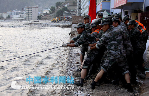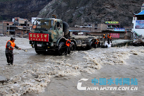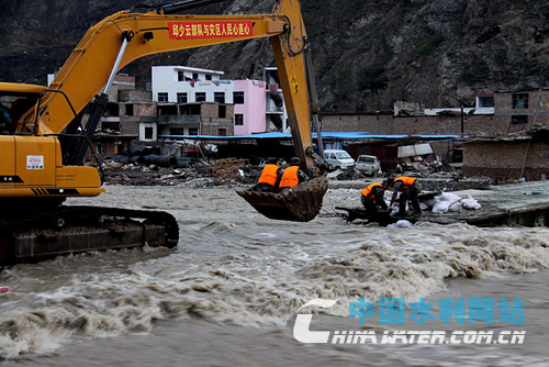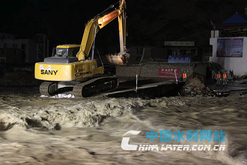 舟曲县城白龙江两岸建筑多,排险作业面狭小,大型施工设备难以跨江到右岸开展施工。大型机械到达右岸标志着堰塞湖开挖可以左右岸同时施工,将大大加快堰塞湖除险速度。