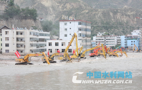据现场抢险的武警水电部队十支队有关人员介绍,他们承担主要开挖任务,需要从三眼峪泥石流堰塞体上游断面一直开挖到城关大桥底下,施工长度达200米左右。今天上午九时正式使用铅丝笼装灌沙石,这样铅丝笼可以形成一个坚硬的整体,乃至铺设成一条作业通道,以便挖掘疏通河道。