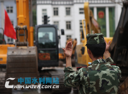 武警水电战士指挥挖掘车入位