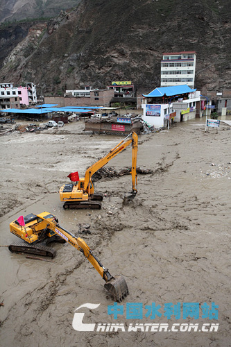 瓦厂桥泄流口,施工机械正将上游泥石挖送到下游