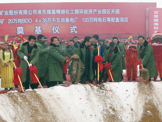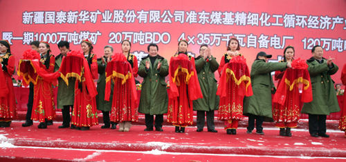 瑞雪兆丰年,准东舞翩跹。新疆国泰新华矿业股份有限公司准东煤基精细化工循环经济产业园开园暨一期项目在准东经济技术产业开发区五彩湾矿区开工奠基。全国人大常委、国土资源部原部长孙文盛出席奠基仪式并宣布项目奠基。水利部老领导綦连安出席奠基仪式并题词祝贺。水利部综合事业局党委书记、局长王文珂,新疆昌吉州州委书记李建国、山西阳煤集团党委书记、董事长赵石平出席奠基仪式并讲话。新疆维吾尔自治区水利厅党组书记伊力哈木?沙比尔、山西阳煤集团总经理裴西平等领导出席奠基仪式。水利部综合事业局副局长郑通汉主持仪式,局总工程师郭潇出席奠基仪式。