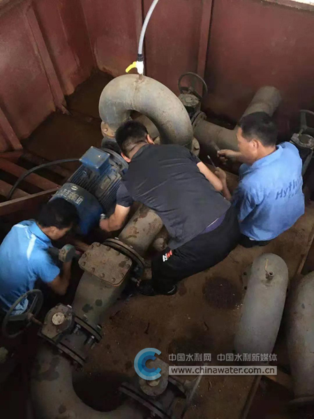 燕子湾水厂工作人员在取水浮船中更换取水泵
