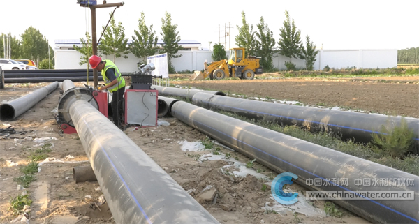 在这个县留智庙镇义和庄村,每根十几米长的塑料输水管道已经有序摆到施工现场,新挖的泥土都覆盖上防尘网。挖掘机开沟,对焊机焊接,地形高程测量等工作正紧锣密鼓展开。