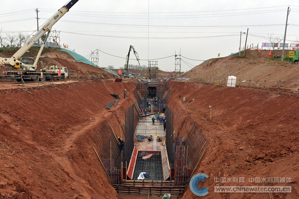 据工程项目部经理裴士英介绍,孟桥川水库主副坝全长4020米,原有4个竖井老化严重,输水不畅,给防汛带来病险隐患。此次整治工程将其全部拆除,集中修建一个新的箱涵引水通道,一面将水引向灌区,满足农田灌溉需要,一面修建一条2240米的倒虹吸管至自来水厂,确保城乡居民生活用水。引水工程进水口闸一共16节箱涵,目前已经完成7节混凝土浇筑,坝下箱涵工程计划于4月20日前全部完成。