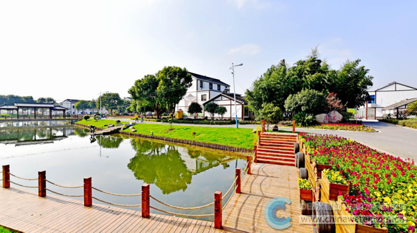 种满缤纷花草的河畔,农房修缮一新,绿树错落有致。沿着江苏省无锡市锡山区锡北镇周家阁村的文化公园一路前行,村庄的秀美风光尽收眼底。