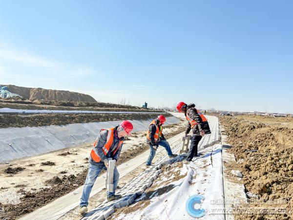 淮河入海水道二期工程(淮安段)河道工程施工3标段建设现场,工人正在进行河道砖石铺砌