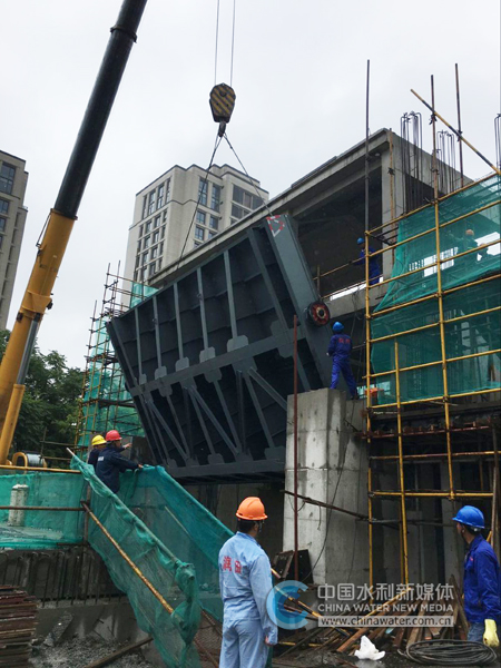 上海浦东:新张家浜西闸主汛期到来前通水 200吨重闸门安装完毕
