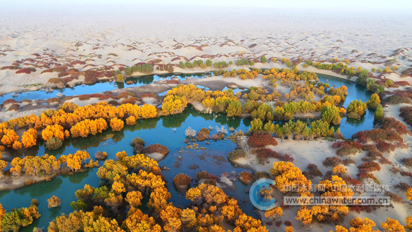 据中科院监测,2000—2017年,塔河干流下游距主河道1公里处的地下水埋深由9.8~10.1米回升到2.1~5.3米;地下水矿化度由5.3~7.8克每升降至1.1~3.0克每升;下游植被恢复和改善的面积达2285平方公里,其中新增植被覆盖面积达362平方公里,沙地面积减少854平方公里,植物物种由17种增加到46种。图为塔里木河干流中游段胡杨林区。