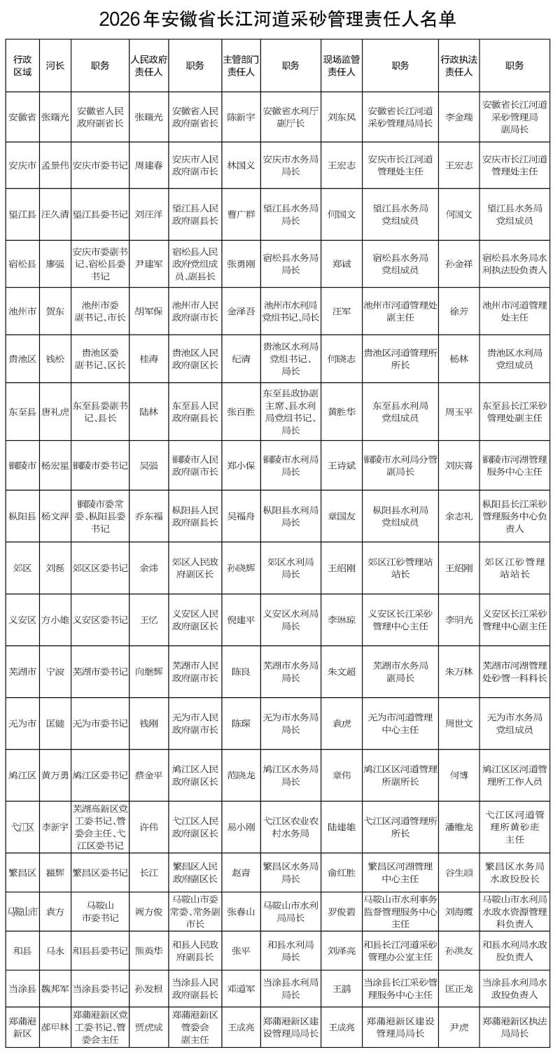 为加强长江河道采砂管理,有效落实长江采砂管理责任制,安徽省明确了2026年采砂管理省、市、县三级河长,人民政府行政首长责任人、水行政主管部门责任人、采砂现场监管责任人和水行政执法责任人名单,特向社会公告。
