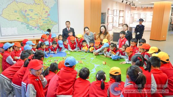 本次活动主要设计“一签二听三体验”三个沉浸式环节。活动现场,学生们在小水滴签名树上郑重签名,粘贴节水承诺,在主题宣传牌前合影留念,共同佩戴“节水卫士”勋章。在沂沭河水利展馆内,讲解员借助沙盘模型,讲述“河流旅行”的故事,生动还原沂河、沭河水系脉络。学生们近距离观察了水利工程模型,了解了刘家道口水利枢纽运行原理与防洪调水功能,感受科技治水的智慧。在环境资源沂沭河巡回法庭,小学生们化身“小法官”“小书记员”等,与法官互动问答,模拟审理水环境保护案件,沉浸式体验司法程序。与此同时,法治广场上的“水利知识大探险”同步进行,答题闯关、水精灵DIY制作等趣味环节,将水法知识、节水技巧等融入实践。