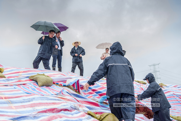 7月15日,在安徽省芜湖市繁昌县孙村镇九连圩南埂段,芜湖市水务局水利专家组组长丁贤青(左一)在暴雨来临前,指导防汛民工用彩条布覆盖滑坡缝隙,防止险情进一步加剧。  肖本祥/摄