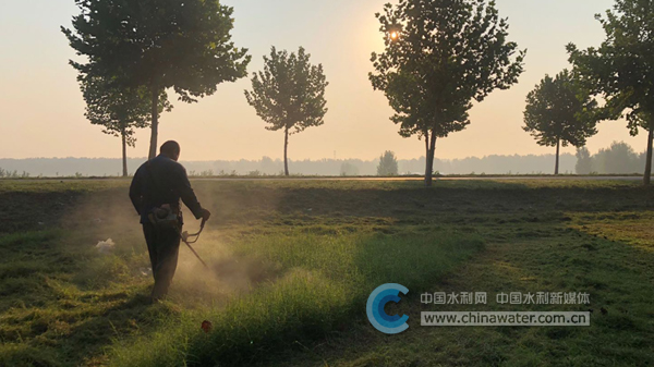 虽已夏末,但是三伏天的炎热仍未褪去,早晨九点多钟的太阳还是让人难以忍受。淤背区边坡里生长的杂草杆又高又硬,人站在里面仿佛裹上了保温层,又闷又热。这里的杂草难以使用机械清除,只能人工打草。黑虎庙管理段的老职工赵西华的责任区里就有一部分这样的难点。