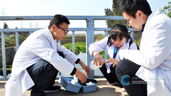 检测人员对肖金河考核断面水样进行日常检测