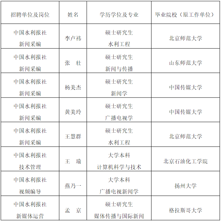 中国水利报社2021年公开招聘工作人员拟聘人员公示