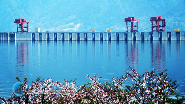 2019年3月28日,春风和煦,阳光明媚。三峡库区湖北省宜昌市境内的沿长江两岸,山花竞相开放。在盛开的樱花和桃花衬托下,位于宜昌市夷陵区三斗坪镇境内的三峡大坝工程,更显雄伟壮观。(王建锋 摄)