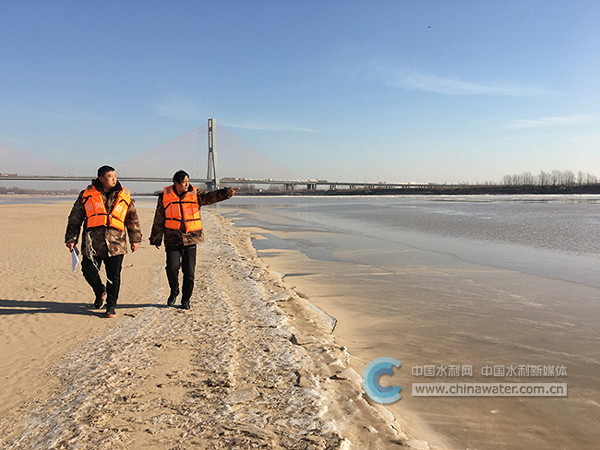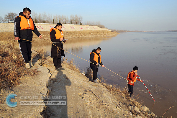 山东利津河务局职工进行冰凌观测 崔慧聪 摄