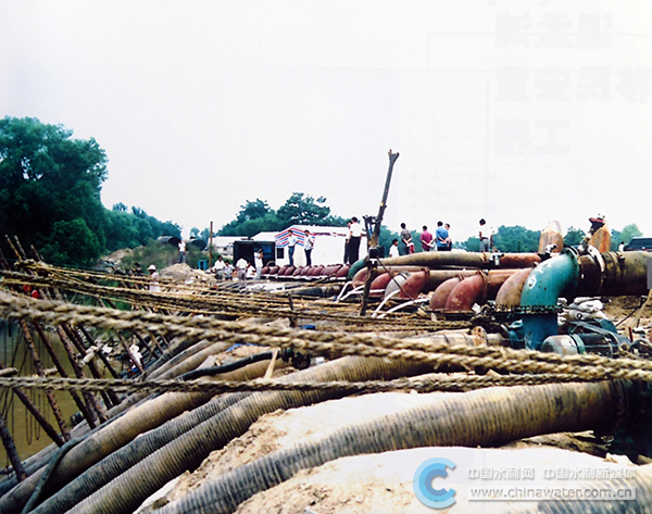 温孟滩工程施工期间,我当时在郑州黄河河务局船舶修造厂工作,主要从事机械制造。1994年,我奉命组建工程施工队并到温孟滩工程逯开区现场考察学习。当年9月份,在逯村坝头上,我们看到各施工单位的陆地泥浆泵组设备安装在坝头上,连接管线一字排开在7千米长的战线上抽淤填土,大家都在抽,但时常抽不出水来,施工效果不好。