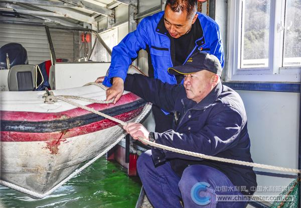 钱东明(右)检查船只安全情况 本报通讯员 于鹏飞 摄